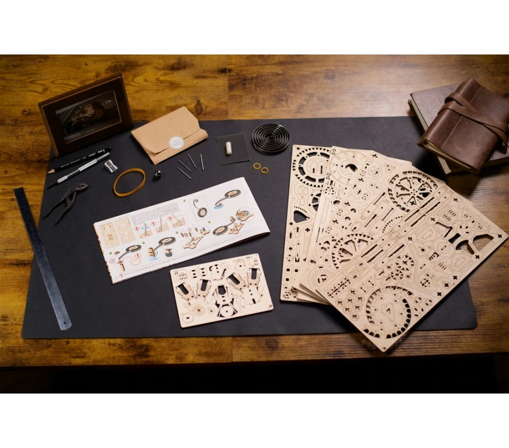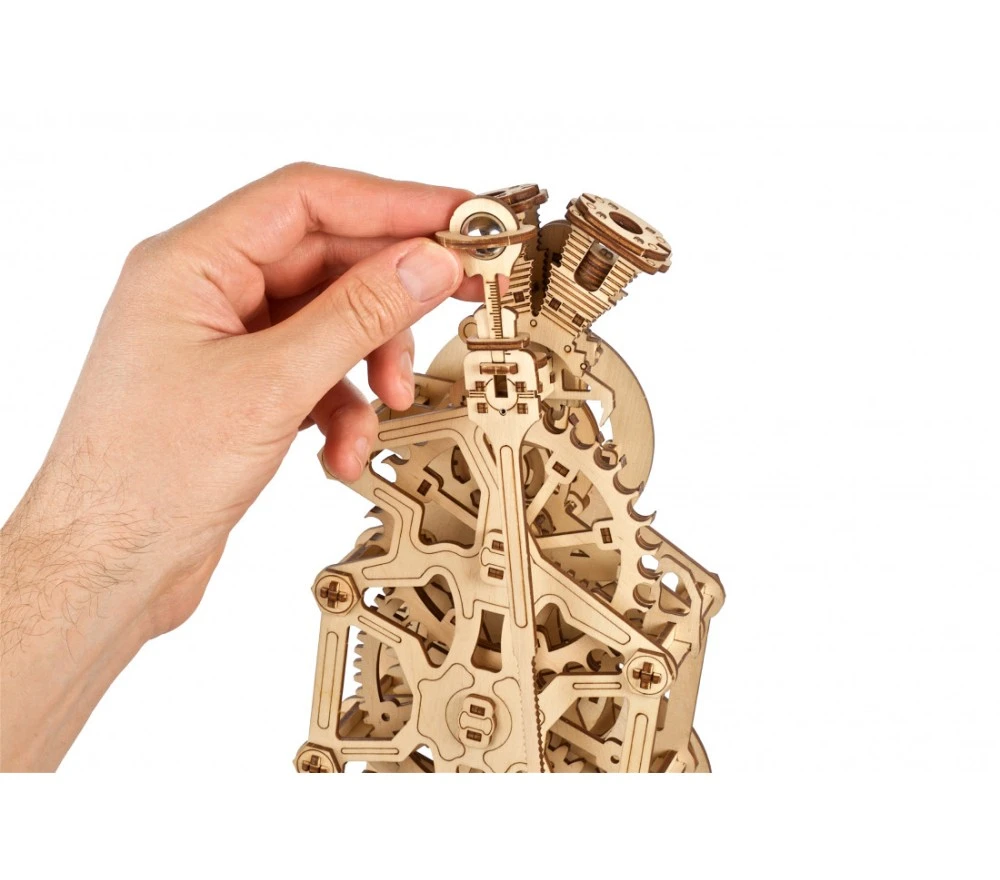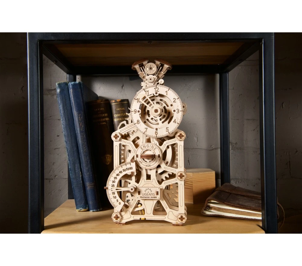 Cosa si dice di un motore con una messa a punto precisa? Funziona come un orologio! Capovolgete il concetto con l’Orologio a Motore di Ugears, un orologio perfettamente regolato che funziona come un motore (e sembra che lo sia)! Questo orologio meccanico da tavolo funzionante con pendolo è a tema motociclistico, con il disegno di un tipico blocco motore a « V » sulla parte superiore.