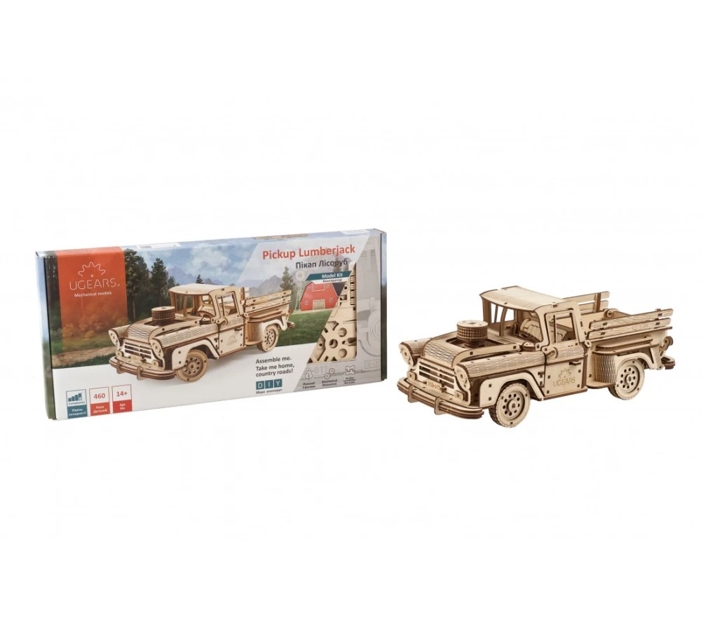 Il Pickup Lumberjack ha 3 modalità: R (Reverse), N (Neutral), D (Forward). L’energia della molla viene trasferita a un ingranaggio per aumentare il rapporto di trasmissione, attraverso il cambio, quindi all‘albero di trasmissione, al differenziale e all’asse posteriore. Un meccanismo Start/Stop situato nel pianale del camion consente di avviare il camion a comando. Poiché questo è Ugears e poiché amiamo concentrarci sui piccoli dettagli stravaganti che rendono eccezionale un modello, un piccolo pendolo sotto i sedili simula lo scuotimento del potente motore di un camion. Il compensato curvato conferisce al modello belle linee e uno stile anni ’50. Le portiere del Pickup si aprono dall’interno e dall’esterno e il portellone si ribalta. Le ruote anteriori possono essere girate usando il volante e bloccate in posizione per curve aggraziate. Il Pickup Lumberjack è dotato anche di sospensioni a molla anteriori e posteriori in modo da non farti rimbalzare troppo su quelle strade di campagna.