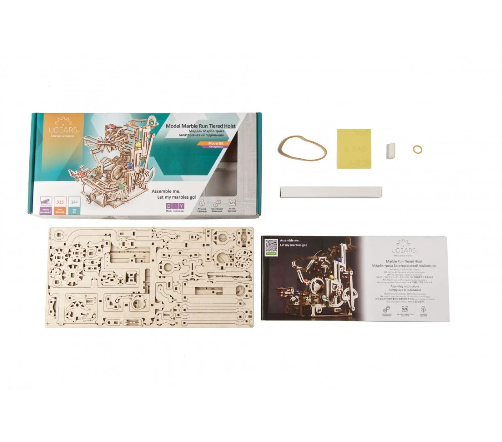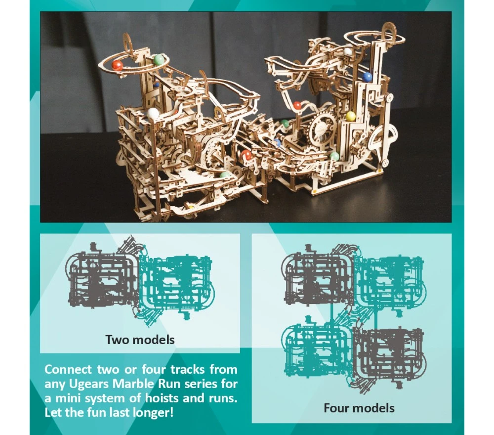 Il modello viene fornito con tutto ciò di cui hai bisogno direttamente nella confezione. Abbiamo progettato la pista per biglie e l’intera linea di binari per biglie Ugears in modo che siano modulari, ovvero la pista funziona da sola o può essere collegata frontalmente o lateralmente ad altre piste di biglie Ugears dello stesso design o diverso ( È possibile collegare 2 o 4 modelli, in coppia, utilizzando gli appositi connettori inclusi nel kit).