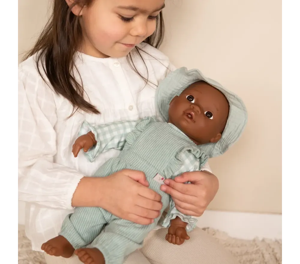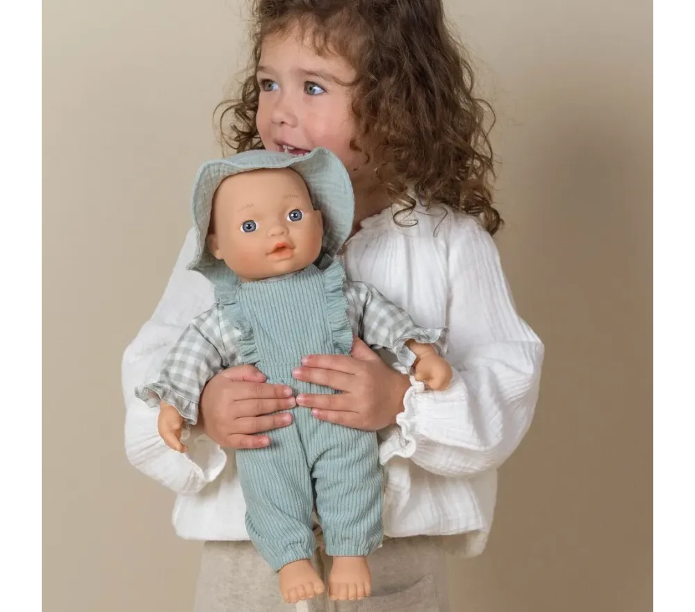 Un set con salopette e camicia e cappellino per cambiare di abito le bambole di Little Dutch (36 cm).
