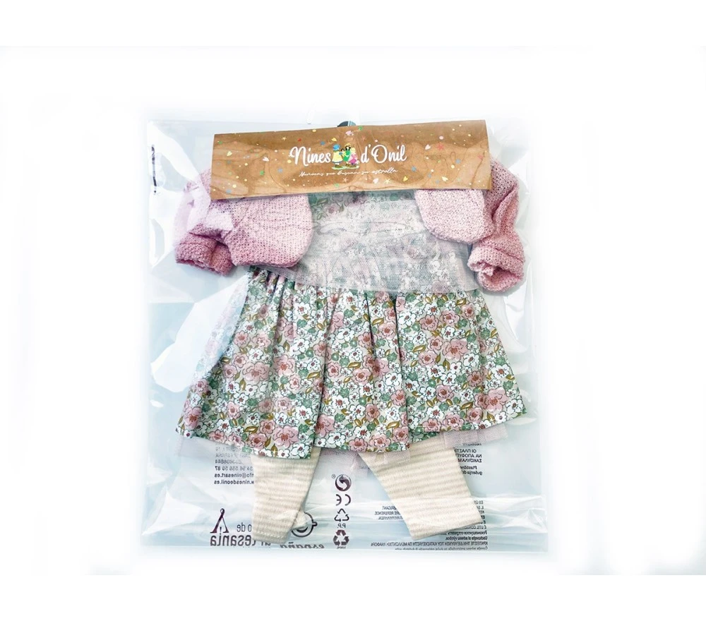 Un abitino a fiori con un bel golfino in maglia rosa antico. Il set comprende anche un leggins a righine sui toni del beige.