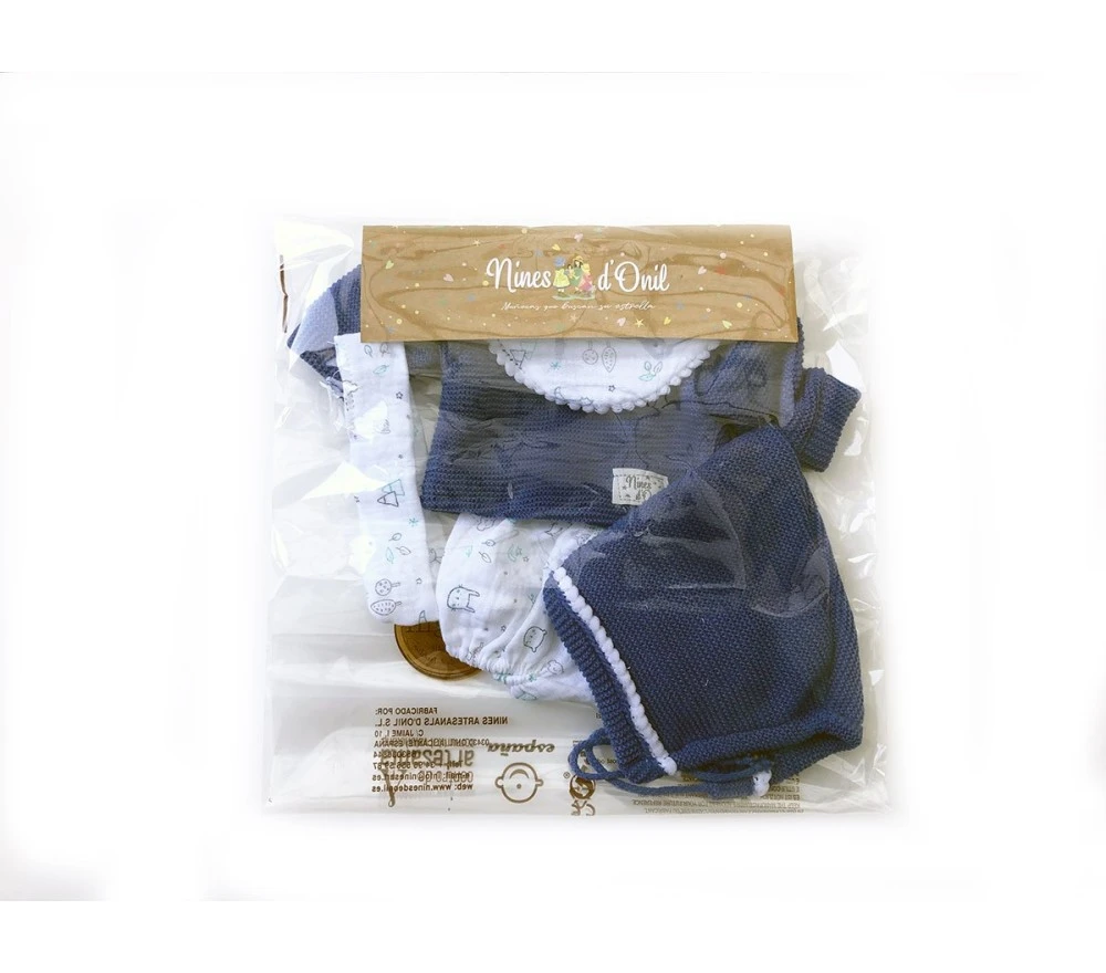 Un completino con maglia blu e pantaloncini, bandana e portaciuccio con una simpatica stampa. Il set comprende anche una cuffietta abbinata.