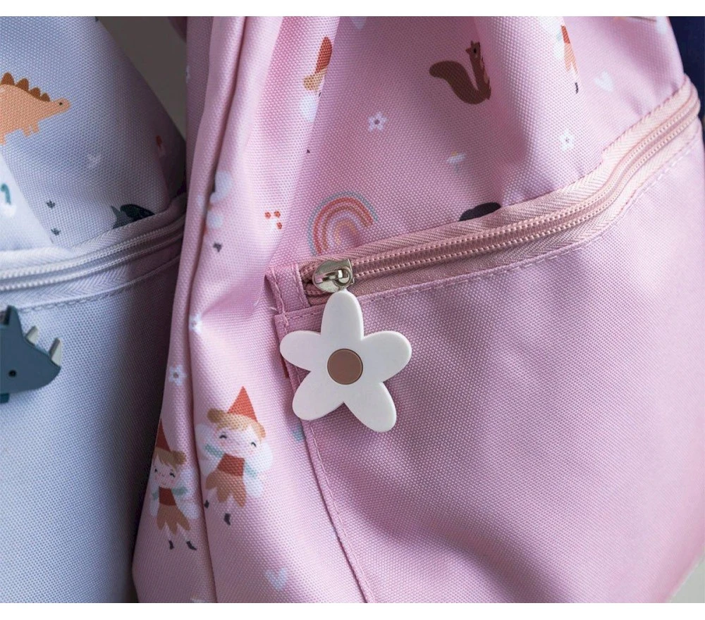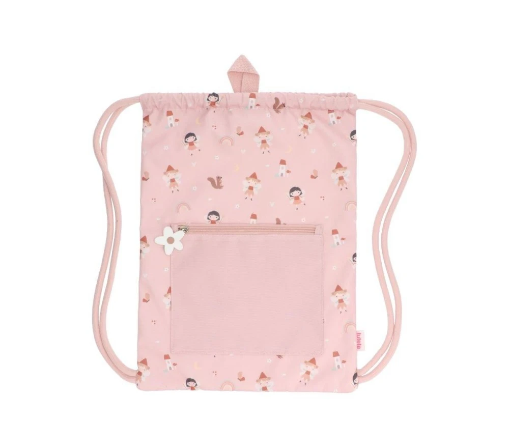 Un pratico zainetto sacca con una deliziosa stampa di fatine e arcobaleni, perfetto per il cambio dell’asilo, per lo sport o per il tempo libero.